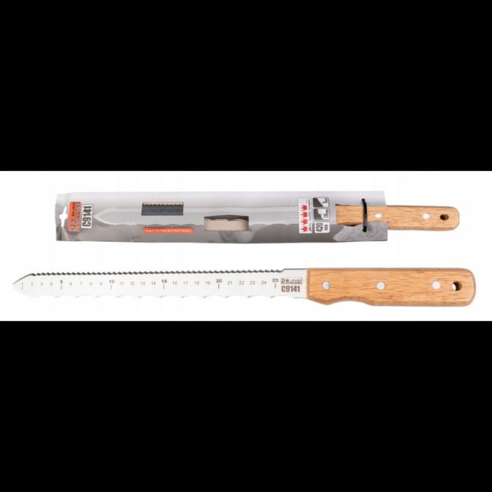 univerzalni 2-u-1 nož duljine 420 mm za rezanje vrhunskog polistirena i mineralne vuneizuzetno koristan kod radova na izolacijizavršeno s posebno profiliranom oštricom za brzo bušenje ruparadni dio dužine 300 mm opremljen je posebnim zupcima, 5 mm (stiropor) s jedne i 20 mm (mineralna vuna) s druge strane, prilagođenim najučinkovitijem rezanju odgovarajućeg materijaladrvena drška spojena zakovicama savršeno leži u ruci, dodatno opremljena ušicom za kačenje na kuku ili provlačenje uzice na zglobpolirana oštrica za glatki rez i povećanu otpornost na korozijuvrhunska kvalitetaTehnički opis:vrsta: Nož za polistiren / mineralnu vunuukupna dužina [mm]: 420dužina oštrice [mm]: 300zub [mm]: 5 / 20težina [kg]: 0,175]]>
