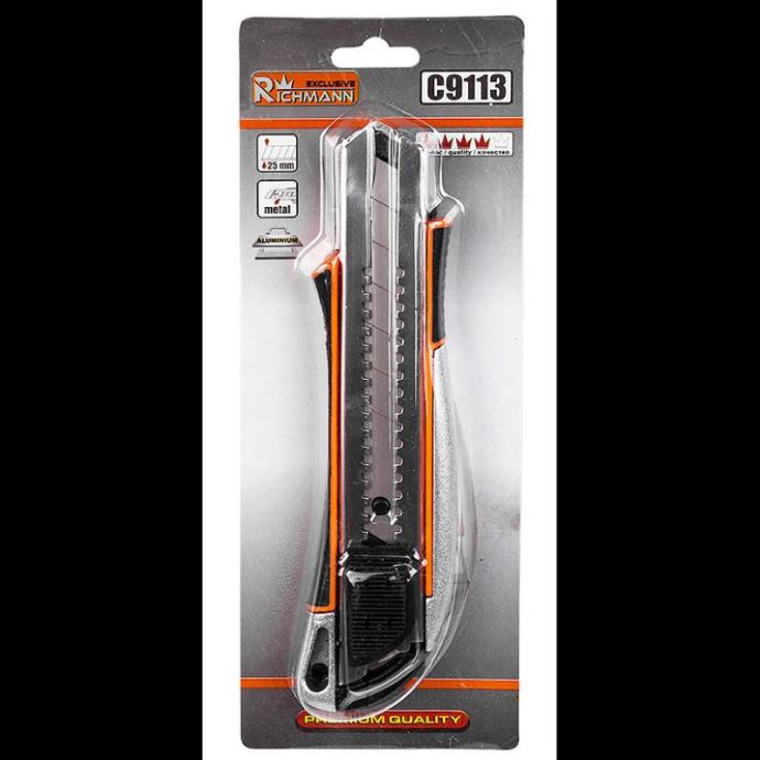 univerzalni nož za tapete sa zamjenjivim oštricamatijelo izrađeno od čelikaaluminijska ručka prekrivena protukliznim materijalomgumb za sprječavanje pomicanja oštrice tijekom rezanjanož opremljen ušicom za vješanje, npr. na karabiner ili narukvicuTehnički opis: tip: Nož za tapeteukupna duljina: 195 mmširina oštrice: 25 mmtežina: 165g]]>