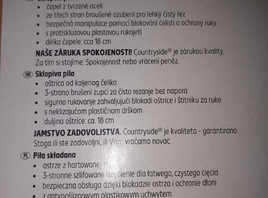 Pogodna za vrtne poslove, kampiranja, i sl. Sklapa se za praktično nošenje. 3-strano brušeni kaljeni zupci za rezanje bez napora. Novo, neraspakirano
