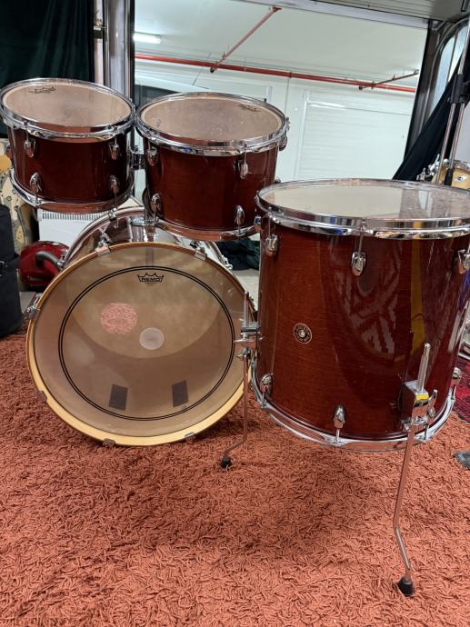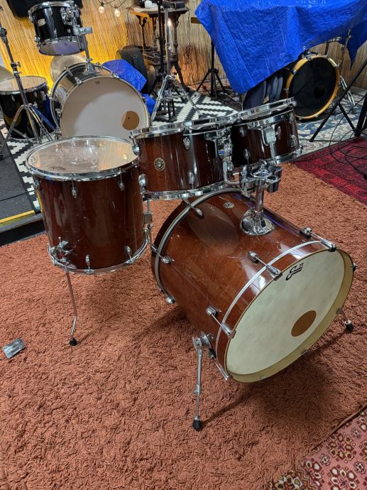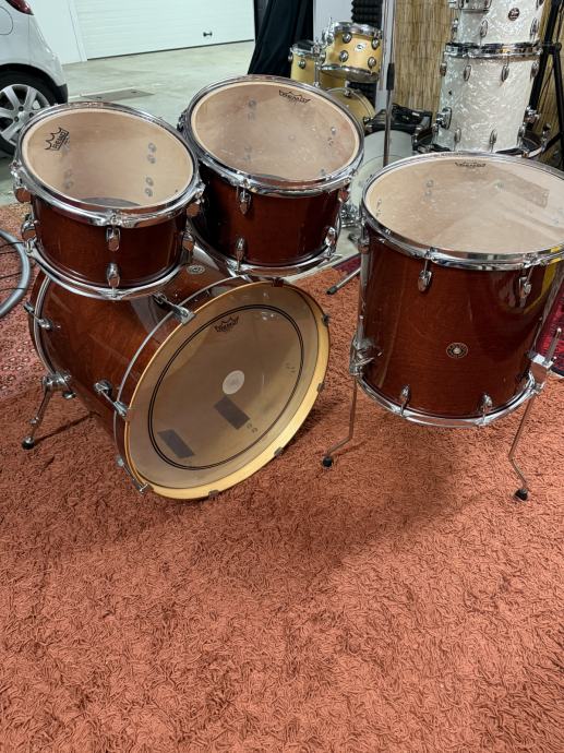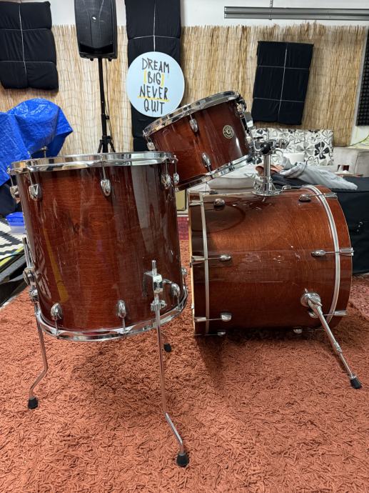 Na tomovima su potpuno funkcionalne Remo Emperor Clear i tvorničke reso plastike, a na kicku potpuno čitave Remo Powerstroke 3 i Evans Calftone s rupom za mikrofon.