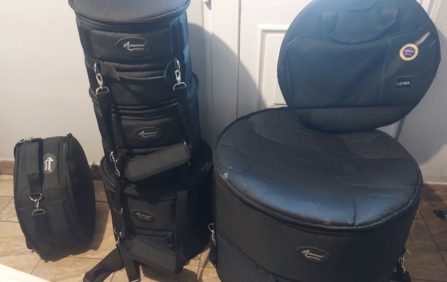 Torbe su u super stanju, debele i kvalitetne.. dimenzije 22, 10,12,14, sner 14, +Gewa torba za činele.