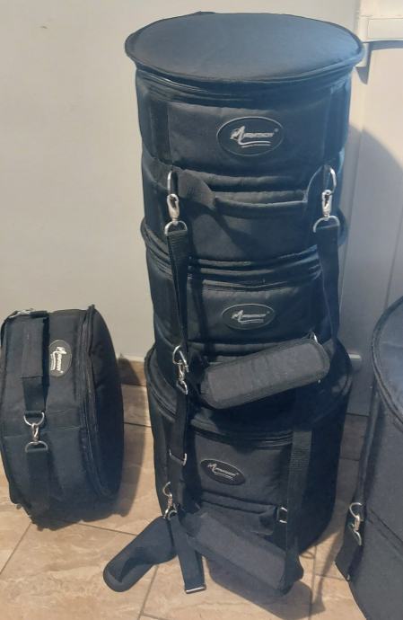 Torbe su u super stanju, debele i kvalitetne.. dimenzije 22, 10,12,14, sner 14, +Gewa torba za činele.