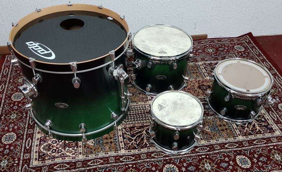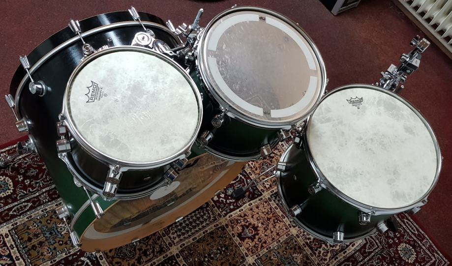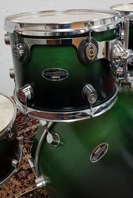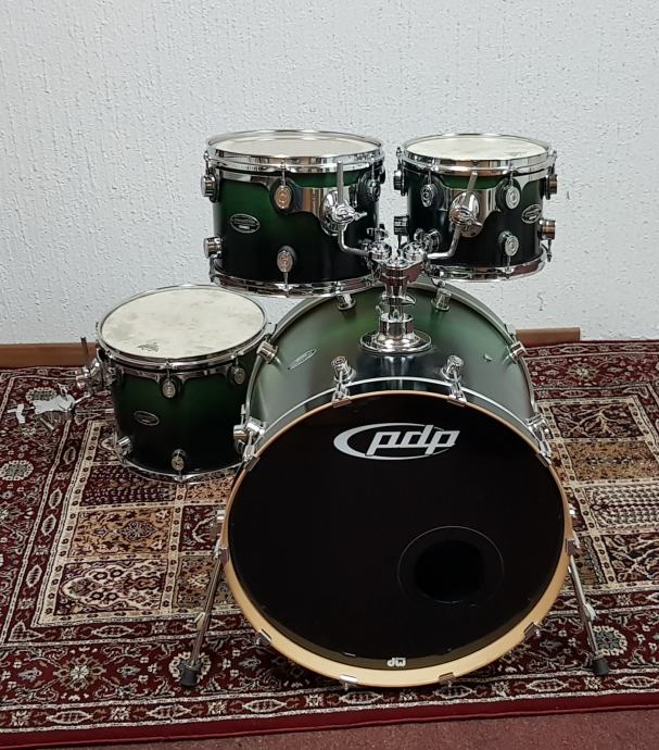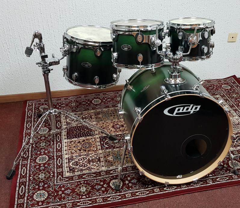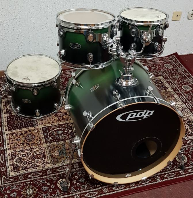 Pdp by DW, MX series (maple, made in Mexico). 22,10,12,14, maple, emerald to black fade, satin finish.