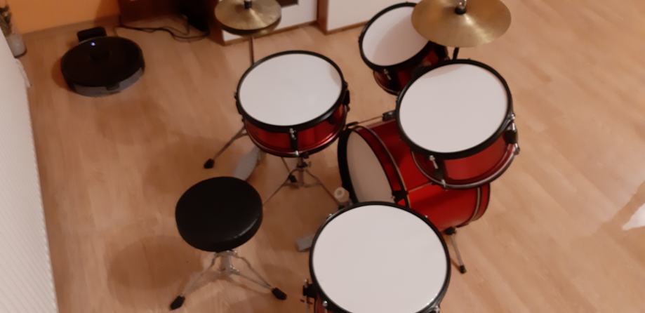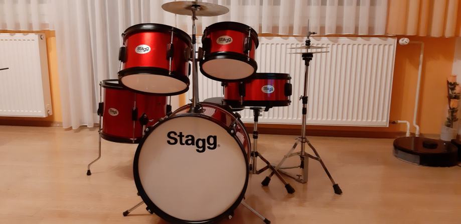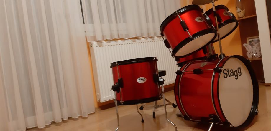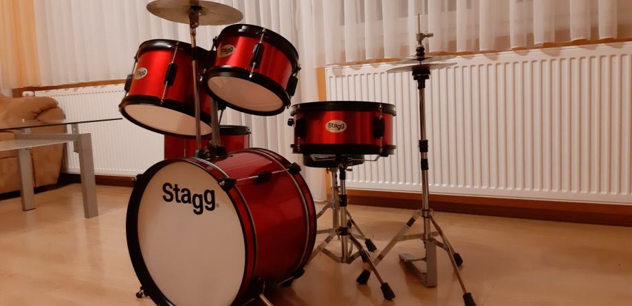 Stagg dječji bubnjevi, malo korišteni i u odličnom stanju. Sadrže bas bubanj, dva toma, floor tom, snare, crash činelu, hihat činele, bas pedalu, ravni stalak za činelu i stalak za hihat i stolicu.