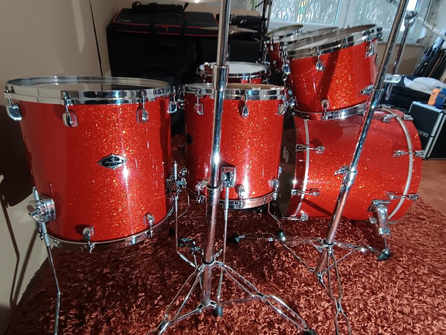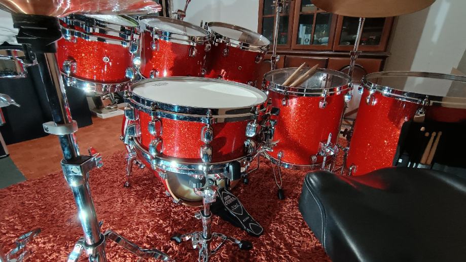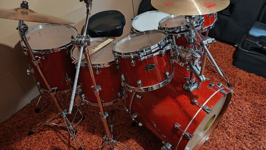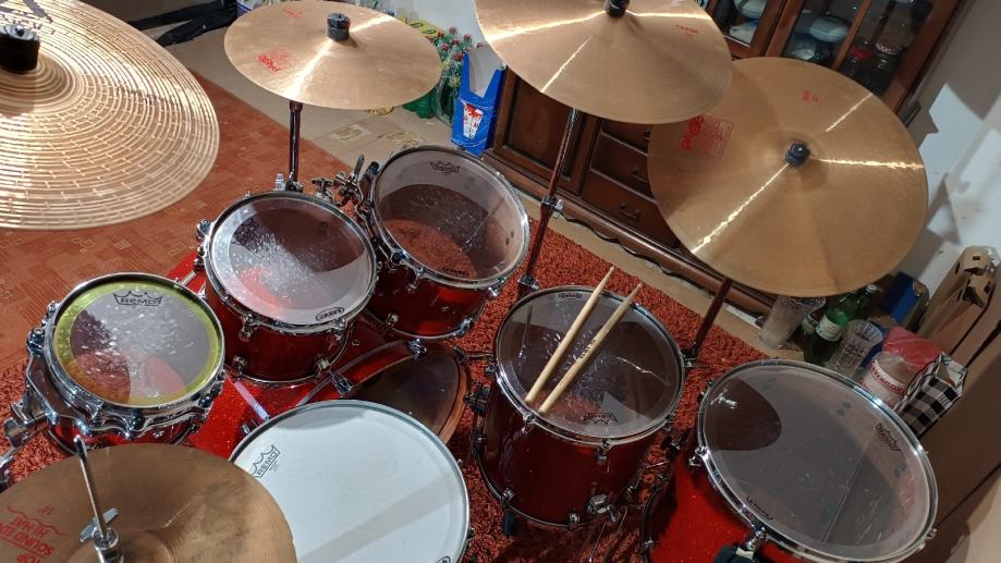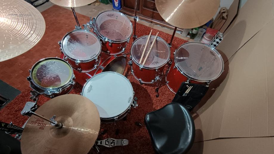 Bubnjevi su jako lijepo očuvani, plastike: snare Remo emperor couted,dole 300 hazy, tomovi i florovi Remo emperor clear, dole Remo ambasador clear.