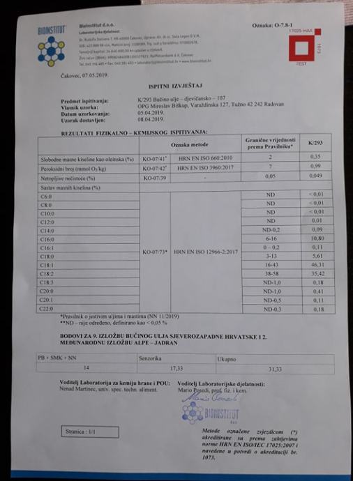 prodajem nerafinirano, 100%-tno bučino ulje, prilikom prerade ne koristi se suncokretovo ulje, pakirano u staklene boce od 0,25 L, 0,5 L i od 1 L.