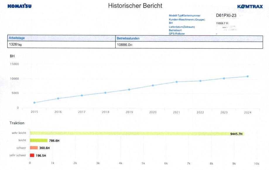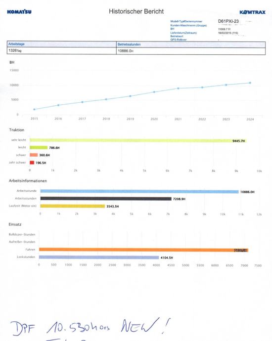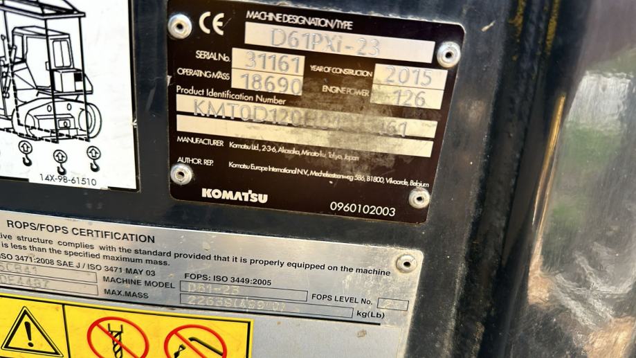 Buldozer Komatsu D61PXi-23 s tvornički ugrađenim 2D i 3D nivelirom, racunalo sa windowsima, 2015 godina, od prvog vlasnika iz Austrije, 11000 r/s, gusjenice promijenje na 8500 sati, urađen kompletan servis, partikular filter stavljen novi na 10530 sati, stroj je izuzetno očuvan, tvornički ugrađen 2D i 3D nivelir, stroj se može isprobati na terenu kod Zaprešića, potpuno ispravan i funkcionalan. U sklopu oglasa je stavljena i slika ispisa radnih sati iz Komatsu programa pračenja "Komtrax", gdje se vidi koliko je stroj točno radio, na kakvim poslovima, laganog, srednjeg ili teskog inteziteta. Zvati na 091/300-3333.