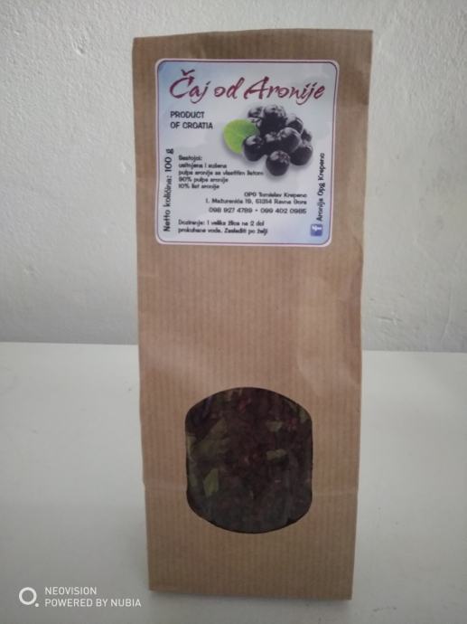 Čaj od aronije sesastoji od sušene pulpe i sušenog lista aronije pogodan za izbacivanje toksina iz tijela. Ispitan na Zzjz.