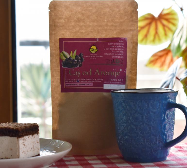Čaj od aronije pakiran u papirnatu vrećicu sa prozorčićem. Sadrži 100 g. Plodovi aronije ubrani su u nasadu aronije na našem Opg-u, sušeni u sušari koja se nalazi u objektima za preradu na našem Obiteljskom gospodarstvu.