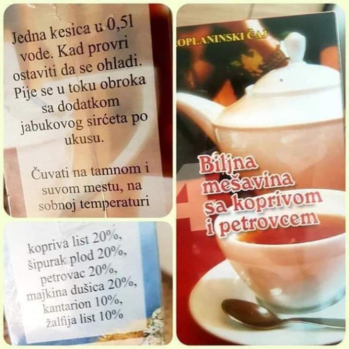 Stavljaju se 2 vrecice na 1l vode sa zlicom jabucnog octa ili limunovog soka.pije se tokom obroka ili pijucka preko cijelog dana.
