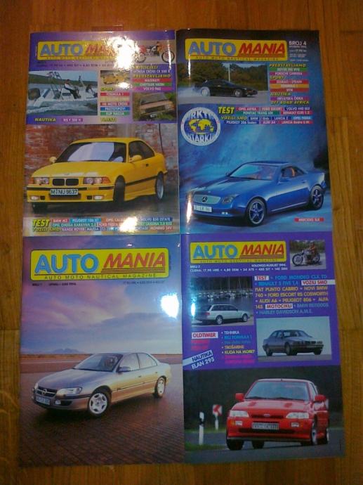 Prodajem brojeve Auto-Manie 1/94, 4/94, 1/95, 2/95, 4/65, 5/95 (sa posterom), 6/95, 7/95, 8/95, 10/95, 11/95, 2/96, 3/96, 4/95, 5/96, 9/96 (s posterom), 10/96 (s posterom), 12/96, 1/97, 4/97 (s posterom), 5/97, 6/97, 7-8/97, 9/97, 1/98, 4/98, 5/98, 6/98, 7-8/98, 9/98, 10/98, 11/98, 12/98-1-99 (dvobroj), 2/99. Može kao komplet ili pojedinačno. Časopisi su odlično očuvani. Šaljem slike pojedinih brojeva ako treba. Cijena po broju 3 eura ili sva 33 brojeva za 90 eura.