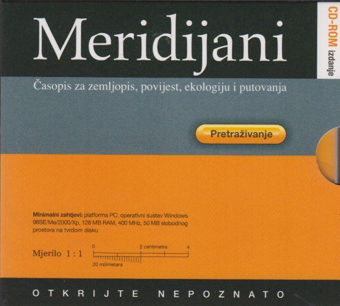 "MERIDIJANI" CD-ROM izdanje sadrži svih 86 brojeva časopisa Meridijani (i sve dodatne materijale – postere, karte i sl.) koje je moguće čitati, ispisati te pretraživati po odabranom kriteriju. Pretraživati se može jednostavno – upisom traženog pojma, ili napredno – pretražujući po autorima, ključnim riječima, godištima i sl. Kolekcija časopisa u digitalnom obliku dolazi na pet CD-ROM-ova, s popratnim uputama i u funkcionalnoj kutiji.