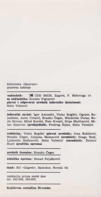 Redakcija: Vlaho Bogišić (glavni urednik); Ivan Božičević, Branko Čegec, Julijana Matanović (urednici); Drago Hedl, Ljubomir Stefanović, Stela Valentić (suradnici); Želimir Borić (grafička oprema).