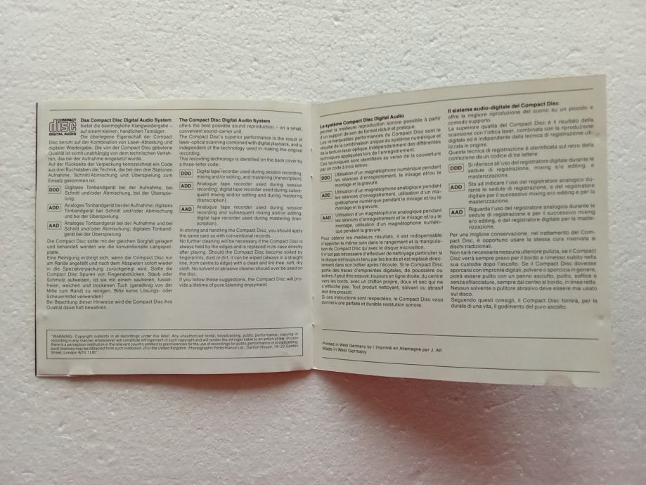 Fotografije priložene uz oglas prikazuju ovdje oglašeni predmet. Disk je u potpunosti slušan neposredno prije oglašavanja, svira bez preskoka, a program kojeg koristim za tzv. ripanje na kompjuter ne pokazuje nikakve greške u njemu. Na prvi pogled, laserska strana diska izgleda kao nova, na njoj postoje dvije-tri neupadljive crtice, koje moj fotoaparat ne može snimiti.