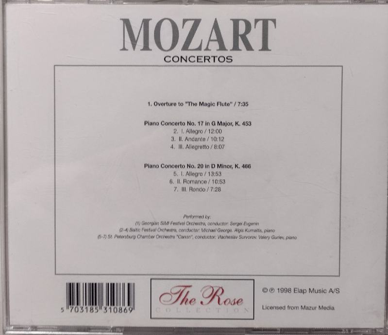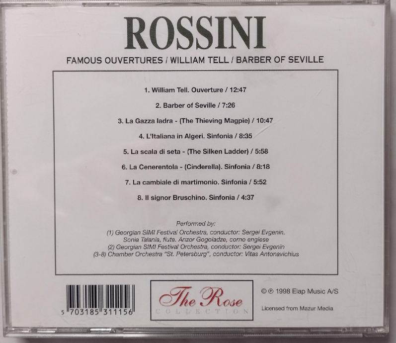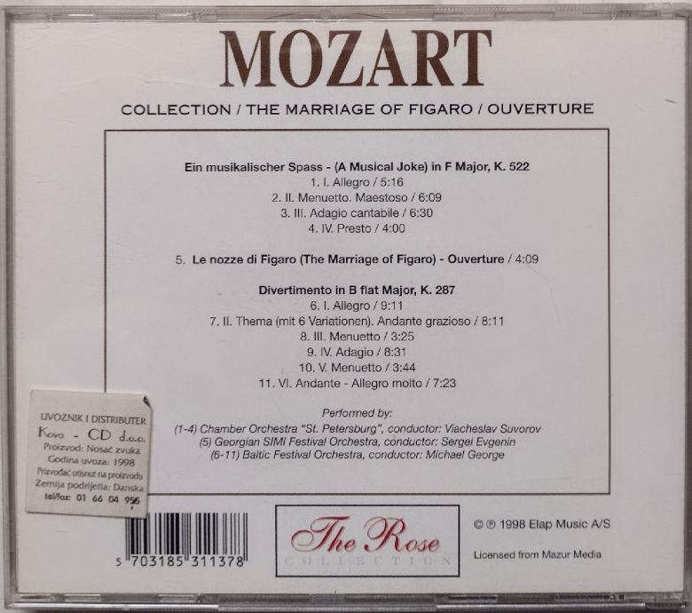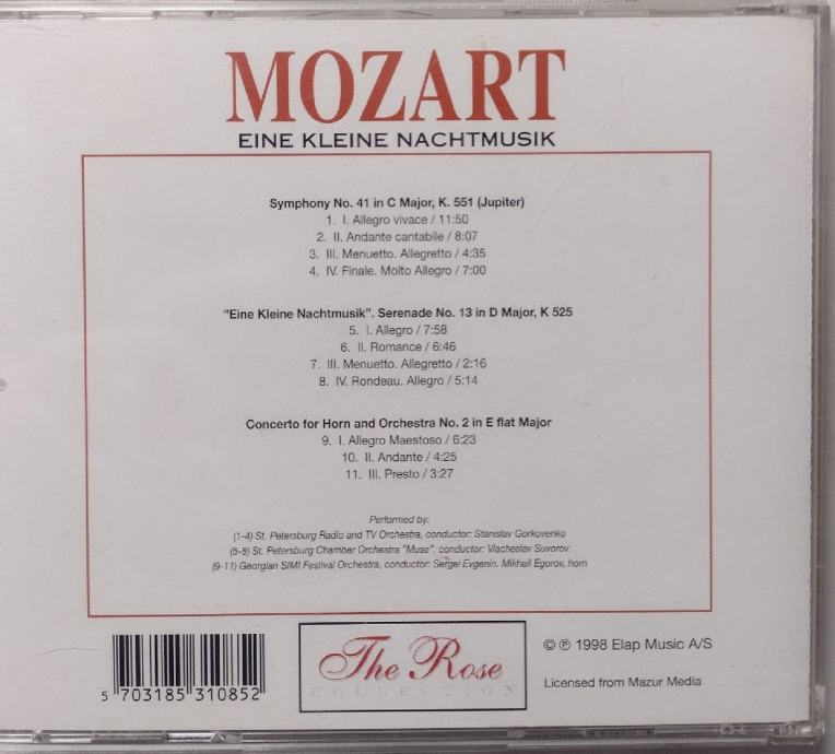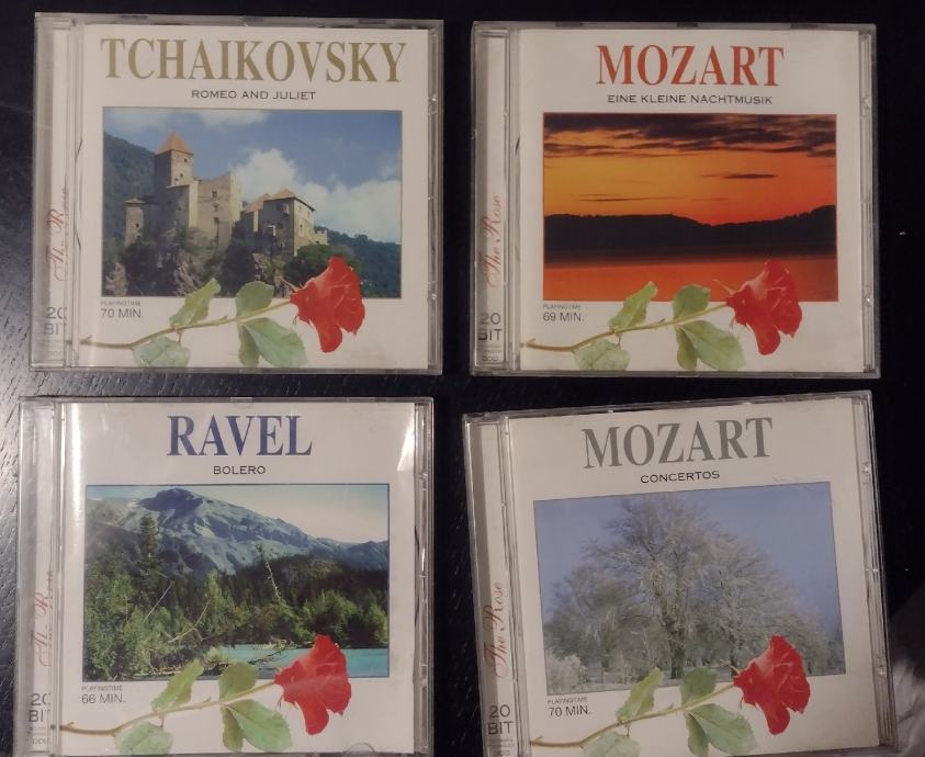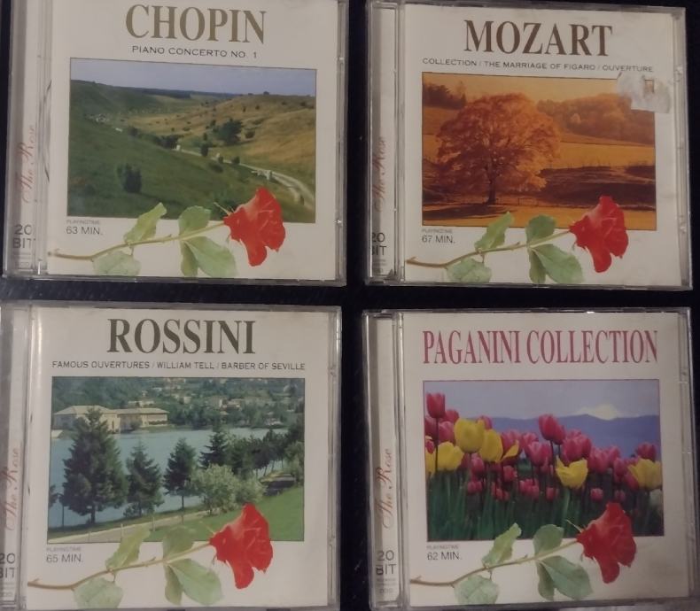 Prodajem 8 original CDa klasične glazbe, Rose Collection, vrhunski zvuk ,odlično očuvano. Cijena pojedinačno 5 eura /kom, a cijena kompleta 40 eura + gratis još 3 CDa iz te kolekcije(Vivaldi-4 seasons, Mozart-Rondo alla turca, Paganini-Violin concerto)