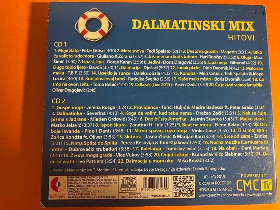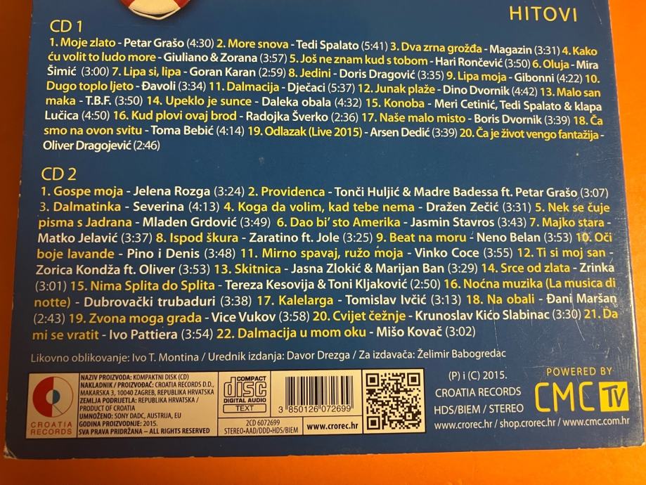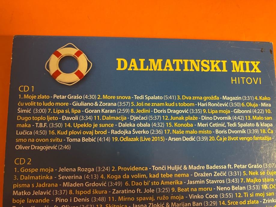 Dalmatinki mix-Hitovi - dvostruki cd sa ukupno 42 dalmatinskih hit pjesama. Cijena je 6 EUR za osobno preuzimanje u Popovači ili Ivanić Gradu. TTroškovi slanja su dodatna 3 EUR Tiskom ili Poštom za unaprijed uplatu na račun ili 5 EUR za plaćanje pouzećem. Pakiram tako da je sigurno u transportu. Odgovaram na pozive, poruke putem Njuškala, SMS, Viber.