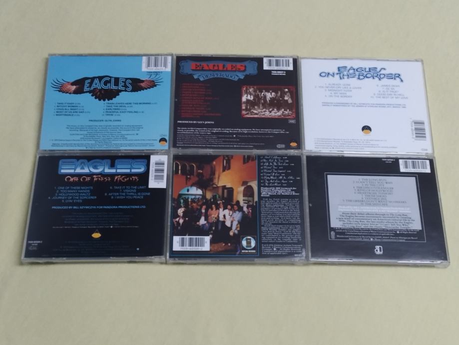 Prodajem komplet od šest originalnih Eagles CD-a, legendarne rock grupe. U kompletu se nalaze albumi Eagles (1972), Desperado (1973), On the Border (1974), One of These Nights (1975), Hotel California (1976) i The Long Run (1979). Svi CD-i su u originalnim kutijama. Radi se o remasteriziranim izdanjima s odličnom kvalitetom zvuka. Komplet sadrži neke od najpoznatijih rock albuma svih vremena s hitovima poput Hotel California, Take It Easy, Desperado i brojnim drugim.