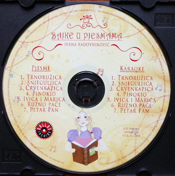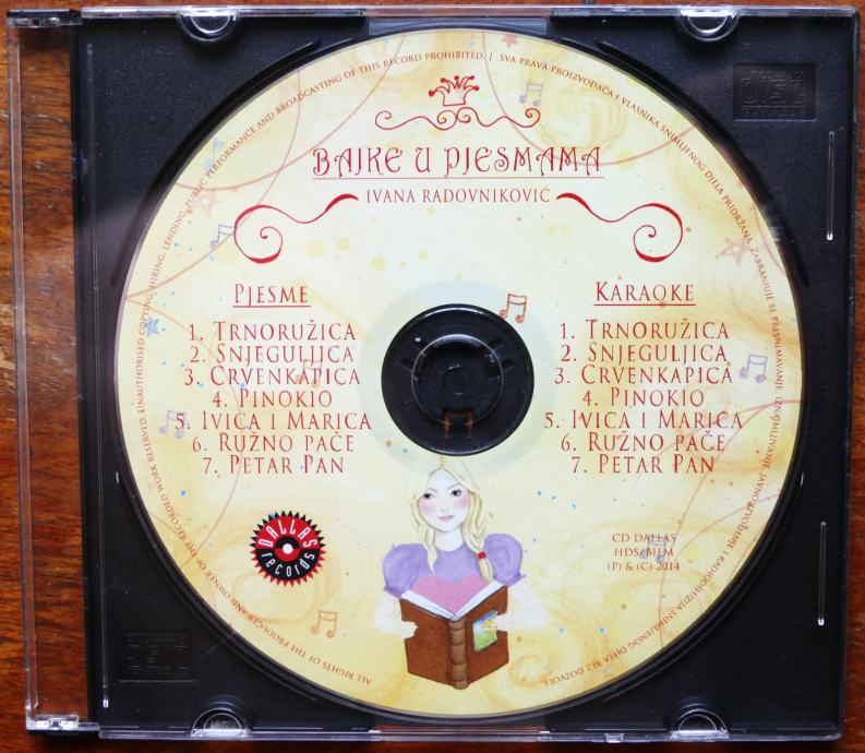 Prodajem originalni CD Ivane Radovniković – „Bajke u pjesmama“ iz 2014. godine. Sadrži verzije pjesama i karaoke verzije – idealno za djecu.