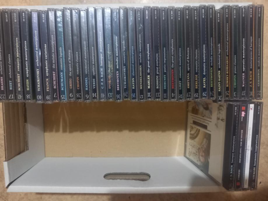Ukupno imam oko 1700 albuma klasične glazbe, ali inače prodajem oko 15 000 CD-ova/albuma. Poredano je po žanru, nažalost nemam popis, nije abecedno poredano, fotografije se mogu uvećati da se sve vidi... ogroman broj hitova i kultnih albuma, očekivana cijena za ostale albume za 1 osobu od 0,5 € do 5 €, ovisno o albumu.
