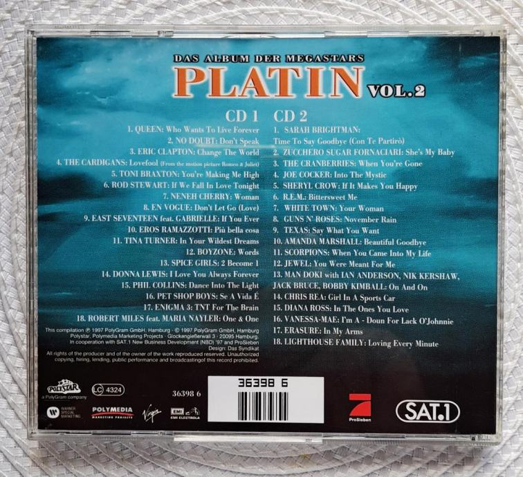PLATIN (Das Album Der Megastars) Vol.2 je druga po redu dvostruka CD kompilacija. Svaki CD sadrži 18 pjesama čiji su izvođaći uglavnom svjetske estradne zvijezde '80ih i '90ih.poput Queen, Clapton, Rod Stewart, Eros Ramazzotti, Tina Turner Spice Girls, Cocker, Gunsi, Scorpions, Chris Rea itd. Izdavači i sponzori su dvije moćne Njemačke medijske kompanije ProSieben i SAT.1.Godina izdanja je 1997.