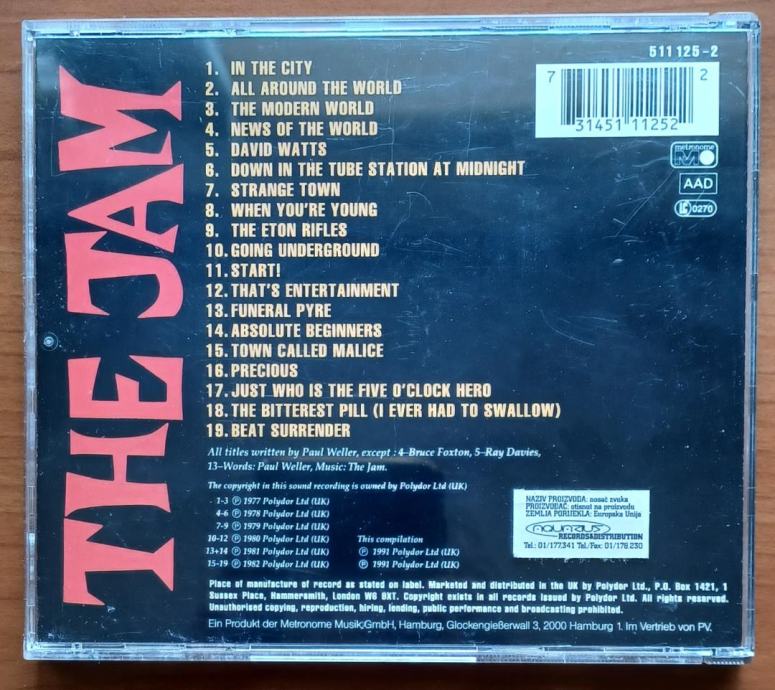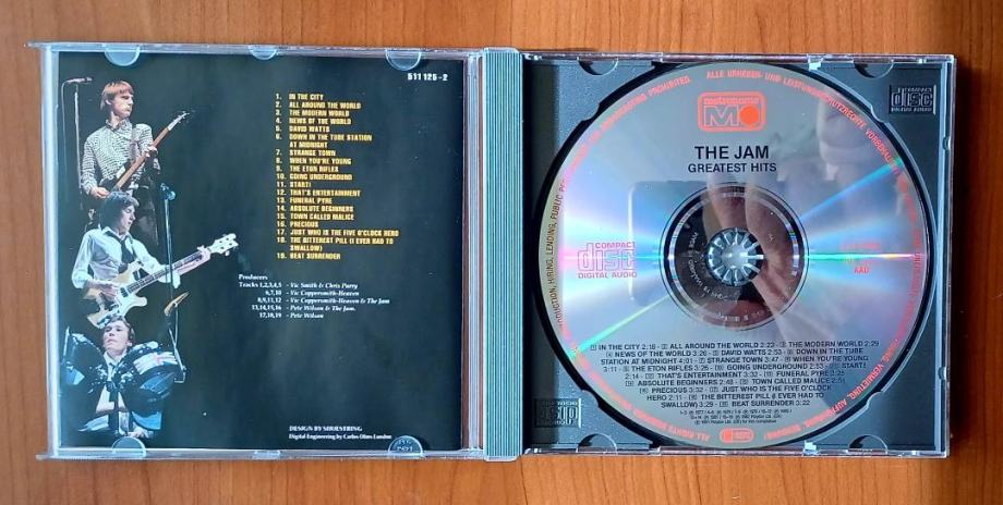 THE JAM je bio britanski sastav osnovan od srednjoškolskih prijatelja 1972. u Surreyu. Debitirali su tek 1977. albumom “In the City”. Od 1977. do raspada 1982. izdali su 18 uzastopnih singlova koji su ostvarili Top 40 UK. Ukupno su izdali 6 studijskih i jedan live album.Nakon raspada objavljeno je još 10 live albuma, 13 kompilacija, 14 muzičkih videa i 7 filmova. “Greatest Hits” je treći kompilacijski album, izdan 1991. Zauzeo je drugo mjesto na UK ljestvici. CD sadrži 19 pjesama. Proizvod je u mint stanju kao i zaštitna kutija.