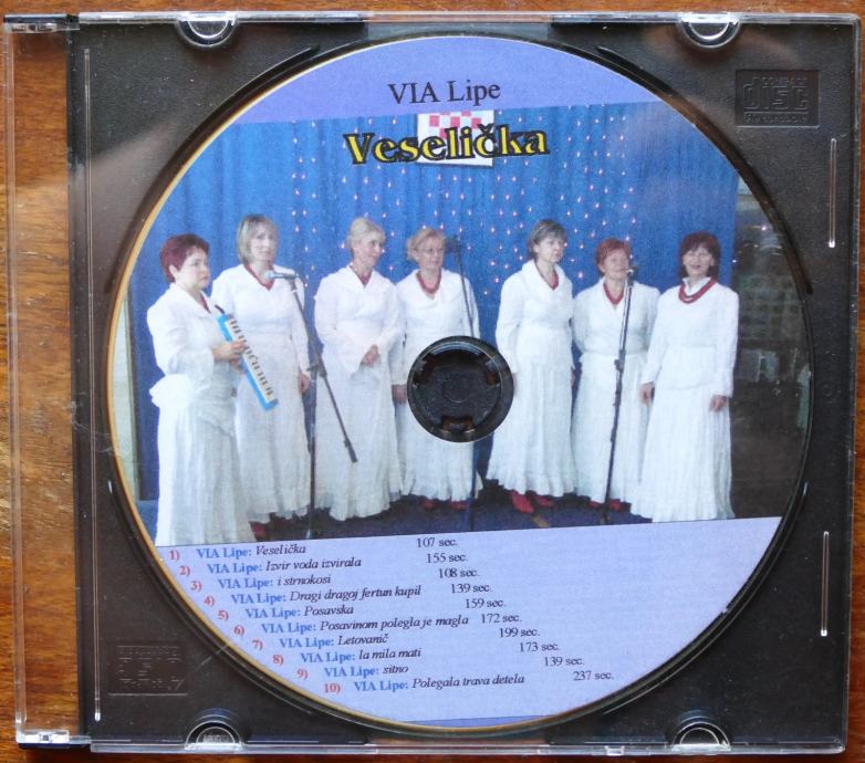 Prodajem CD VIA Lipe – “Veselička”, raritetno i teško dostupno izdanje ženskog vokalnog sastava koji njeguje tradicijsku glazbu Posavine i šireg područja.Na CD-u se nalazi 10 pjesama, sve u izvornom narodnom stilu, snimljeno za kulturno-umjetničke nastupe i arhivu društva.