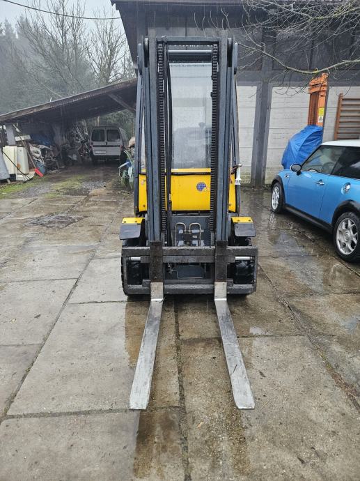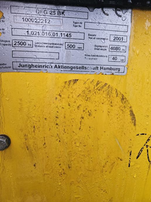 JUNGHEINRICH DFG 25 BK, 2001. g., IMA UGRAĐEN ATESTIRANI ADR SUSTAV MIRETTI(smanjuje ispušne plinove i spriječava iskrenje iz istog te se može koristiti u zatvorenim prostorima, zapaljivom okruženju i prehrambenoj industriji), DIŽE 2500kg, VISINA PODIZANJA 4m, BOČNI POSMAK, MOTOR PERKINS DIESEL 4 CILINDRA, 40KW, ODLIČNO STANJE, UREDNO ODRŽAVAN, NAPRAVLJEN SERVIS, POTPUNO SPREMAN ZA UPOTREBU, 098278300
