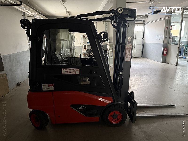 Vrhunski očuvan četverokotačni električni viličar Linde E16 P, serija 386-02 EVO, sa zatvorenim kabinskim prostorom i svim ključnim funkcionalnostima za učinkovito, udobno i sigurno rukovanje.