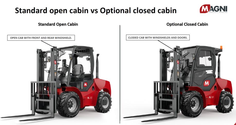 Otvorena kabina (prednje i stražnje vjetrobransko staklo), dijagnostički sustav na vozilu, prednji i stražnji brisači, tipka za zaustavljanje u nuždi unutar kabine, svjetla za cestu sprijeda i straga, ručna parkirna kočnica, LED prednje radno svjetlo, plavo svjetlo, zujalica za vožnju unatrag, treptajuće žuto svjetlo, 4-inčni LCD zaslon u boji, standardan kran 3.0 m, vilice dužine 1,20 m, bočni pomak vilica