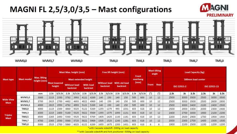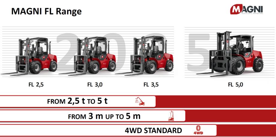 Tvornica MAGNI proizvodi preko 50 modela teleskopskih viličara, roto viličari se proizvode do visine dizanja 45 m i nosivosti 10 t a