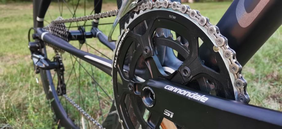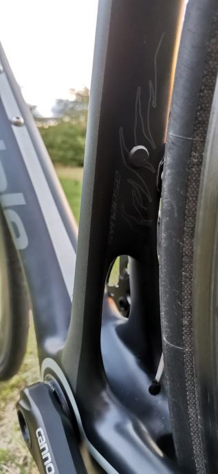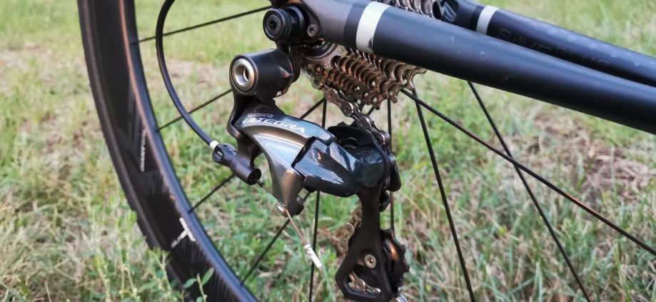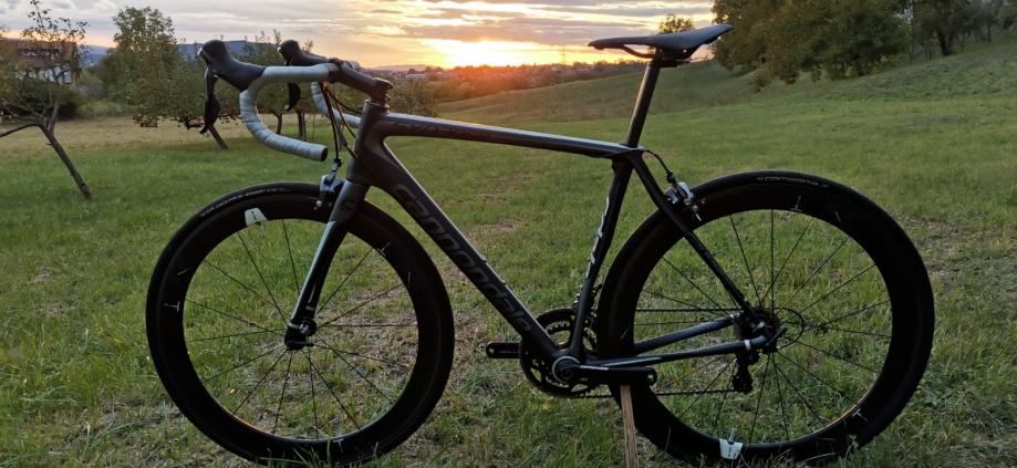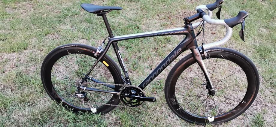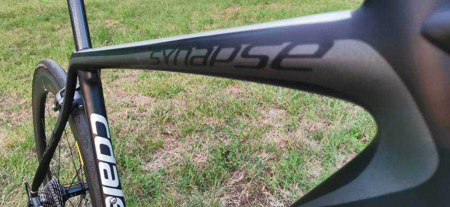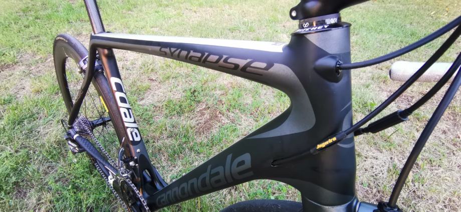 Cestovni bicikl, Cannondale Synapse, prvi vlasnik. Okvir veličine 54 grupa Ultegra 11, pogon Cannondale Si spider 110 52/36, Sic Fizik Antares karbon, WR karbonski nosač sjedala, karbonski kotači 50 Giant 00 tubeless ready, kazeta Ultegra 12/27, volan FS Energy 42, kork Fizik, lula volana Deda zero 11 - može se promijeniti kraća ili dulja prema geometriji vozača. Gume GP4000