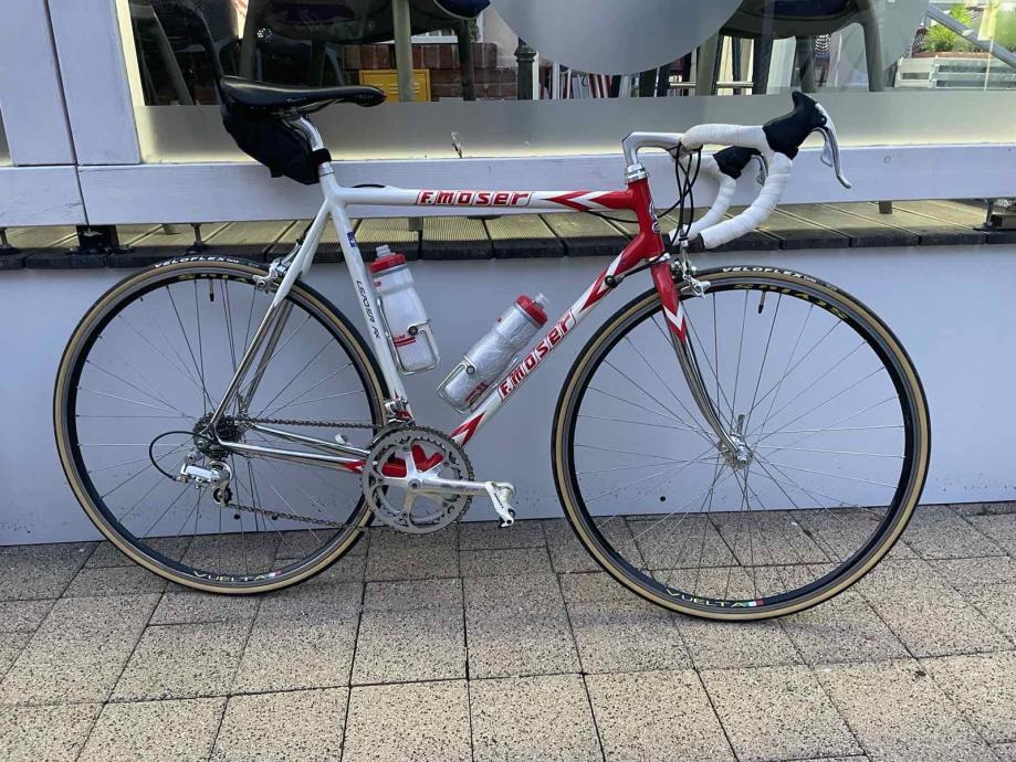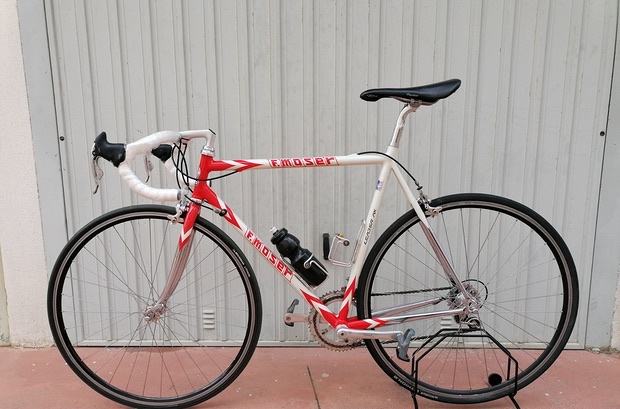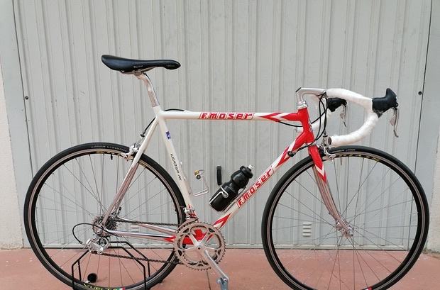 F.Moser Leader AX, 55 cm, Dedacciai Zero tubing, Campagnolo Veloce 2x9 grupa, Athena čeljusti kočnica, Flite Titanium sjedalo, Team Saeco bicikl. Kompletno servisiran. Nove gumice kočnica, Veloce kazeta 12-26, novi Record lanac, nova traka volana, nove sajle i bužiri. Bicikl je potpuno tih u vožnji.