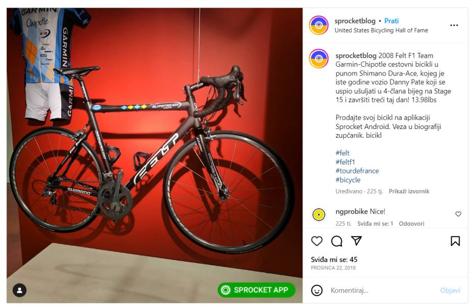 Karbonski cestovni bicikl iz 2007. Model koji je vožen na turu 2008. Puni naziv Felt F1 Team Garmin - Chipotle.