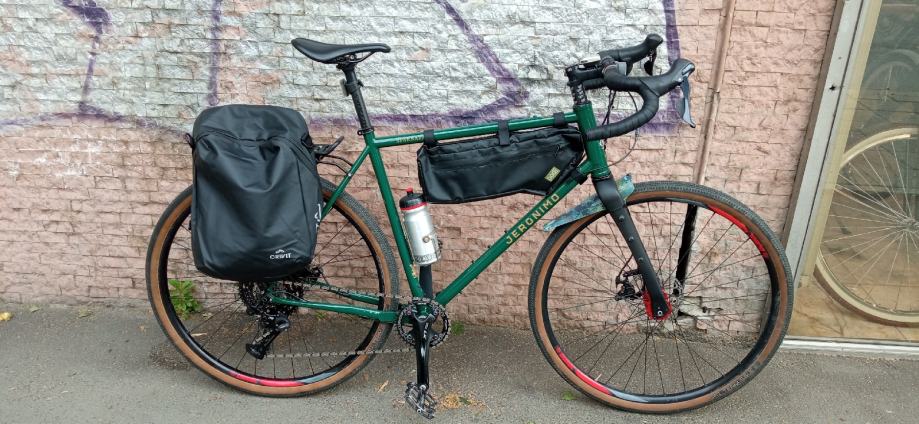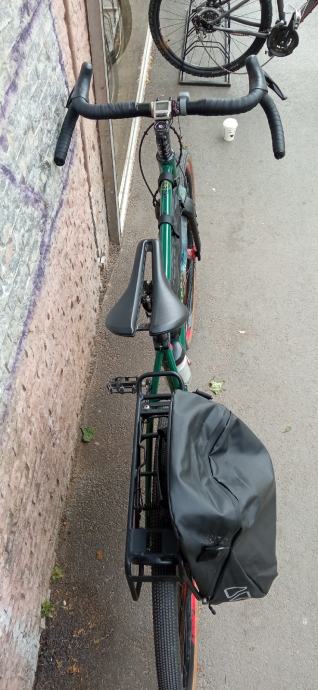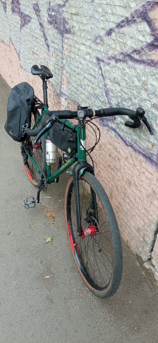 Rama kupljena prije 3 mjeseca. Crmo 4130, Shimano sora 1x9 shifteri, zadnji mjenjač microshift m9, sun rims 30mm kotači,trp kočnice vila carbon. 142x12,100x12. Veličina 58cm do jedno 190 visine. Prodaje se bez torbi.