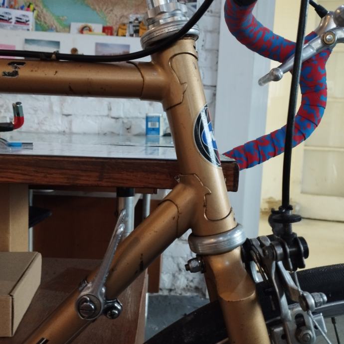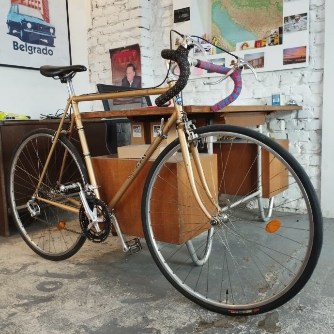 There are a few tiny scratches on the paintwork, resulting from storage in a cellar. The bike has been fully serviced, with the cables, brake lines, and handlebar tape replaced. The bearings have been cleaned and regreased. The bike is ready to ride – a piece of Austrian cycling history.