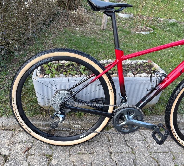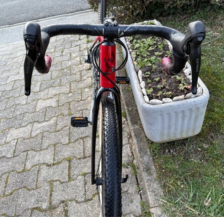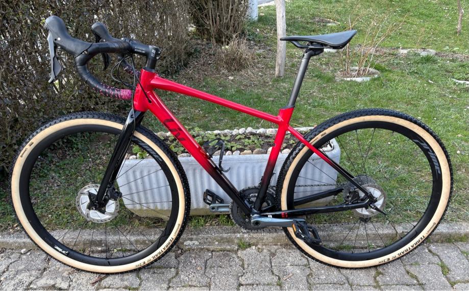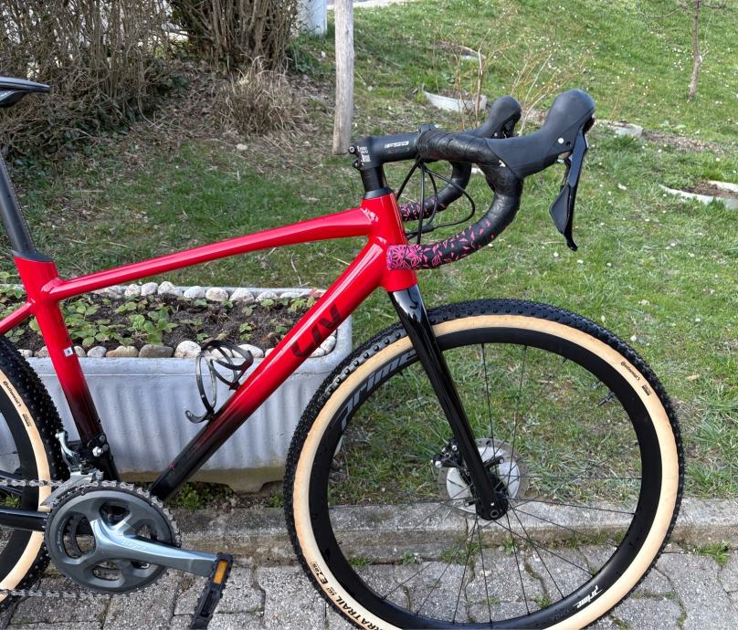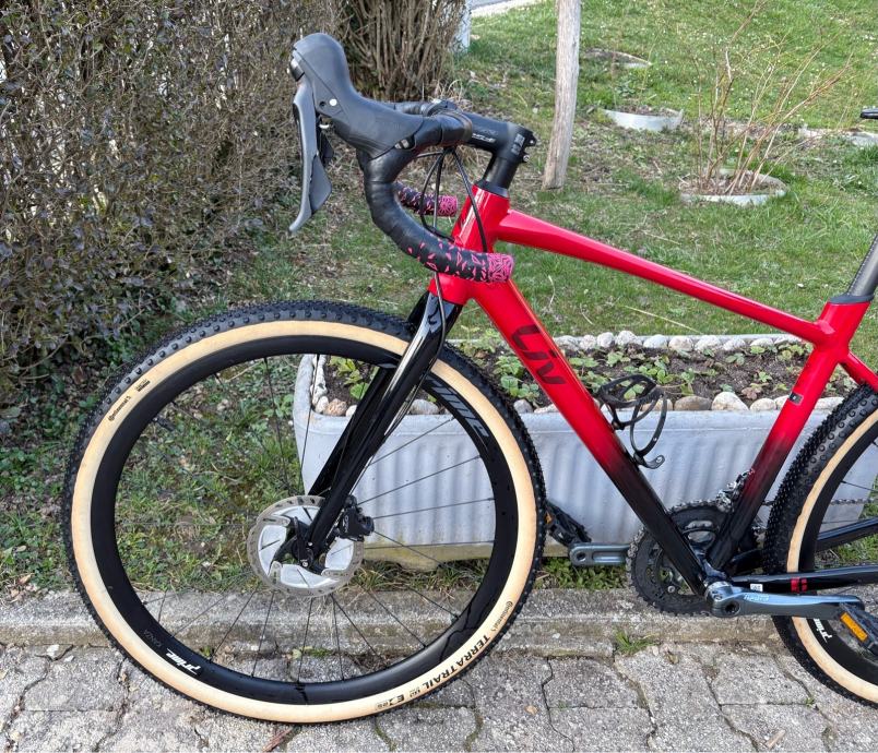 Okvir je Liv Avail AR, ručice i kočnice su hidraulični Shimano GRX, pogon i mjenjači su Tiagra 2x10 (kurble su 170mm), kotači su karbonski 650b(27,5) Kanzo Prime sa Continental Terra trail (složene tubeless).