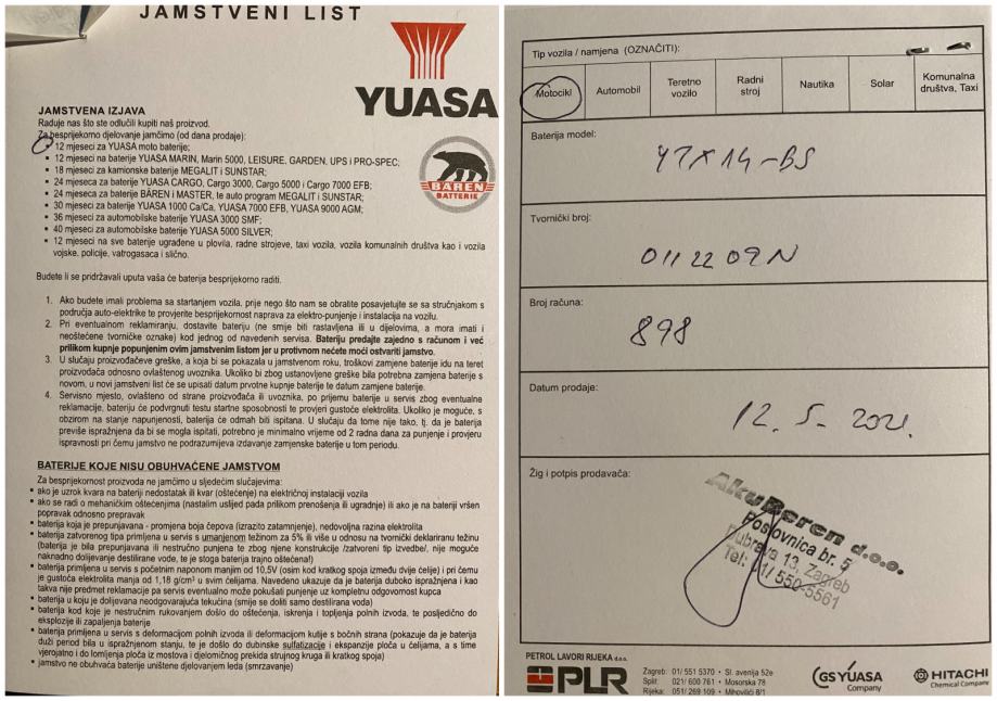 - Instalirana je NOVA baterija (12.5.2021., YUASA YTX14-BS), jamstveni list u prilogu.