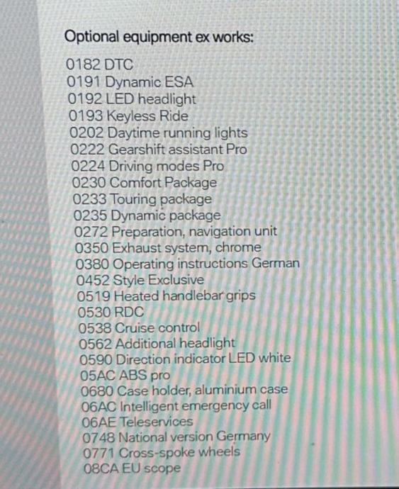 ●Svi paketi opreme, dynamic ESA, quichshifter PRO, modovi vožnje PRO, grijanje ručki, tempomat, tft, keyless, maglenke, crashbarovi, štitnici ručki, RDC, adaptiv led far, ABS PRO, priprema za kofere, priprema za navigaciju, utičnica 12v...