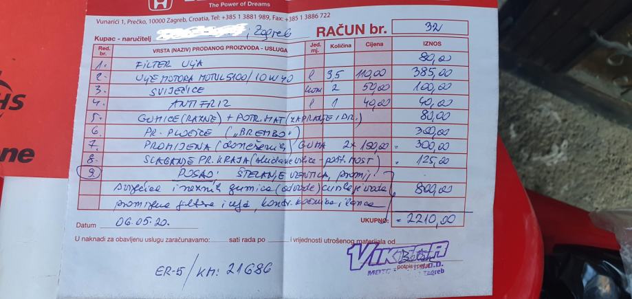 Do sada kod mene (Viktor Moto Sport), štelanje ventila, svjećice, popravak dihtunga sustava za hlađenje (poznata boljka), gume 2022 (Pirelli Angel City), K&N filter zraka, repariranje vilca isto Viktor (1000kn). Promjena sajle brzinomjera.