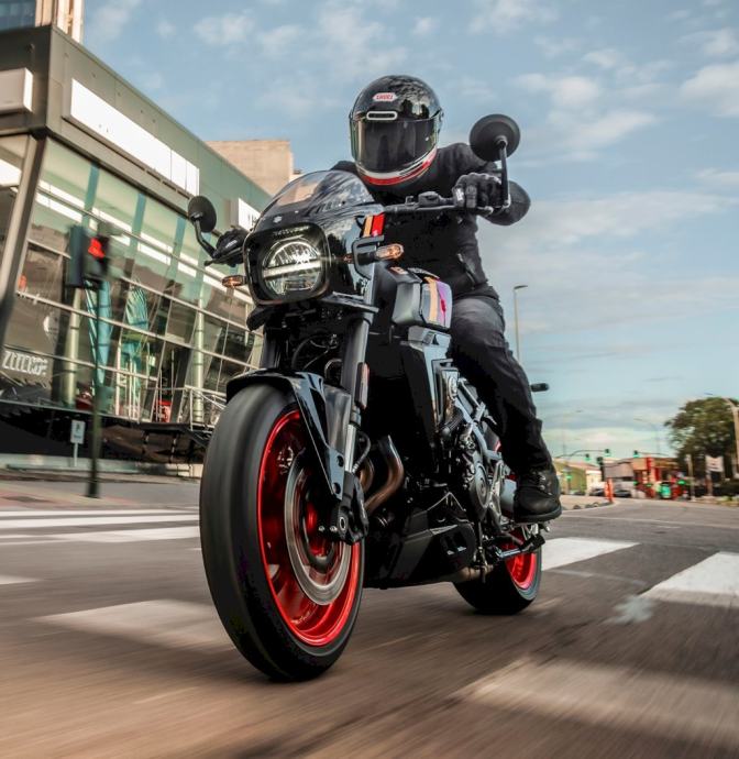 Suzuki GSX-8TT kreće se kroz gradsku periferiju s nadvožnjakom iza sebe