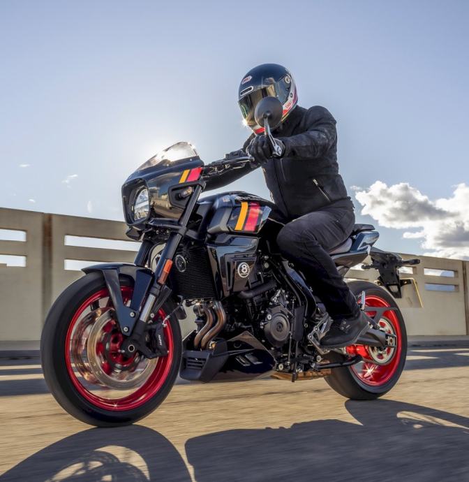 Suzuki GSX-8TT vozi se kroz predgrađe grada s mostom iza sebe