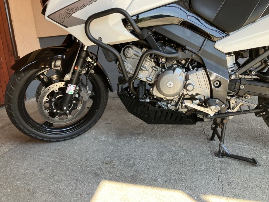 Da, da, ima je. Idemo od prednjeg dijela. Dodatni vjetrobran s podesivom visinom. Držač za mobitel univerzalni. 2x USB izlaz s prekidačem. Renthal aftermarket povišeni volan atestiran. Crash barovi s obje strane. Skid plate s donje strane za zaštitu motora. Kolega napravio novi sic za njega da guza ne boli i potvrđujem da stvarno ne boli. Ja sam ručno radio nosače za bisage za njega prema nacrtima koje sam našao za univerzalne nosače na netu. S motorom dajem te nosače i te torbe koje sam na njega stavio (šivane u Poljskoj od dečkiju koji se baš bave time, svaka ima 30 litara kapaciteta i dobro su stvarno napravljene). GIVI top case. Cerada za cijeli motor. Novi zadnji zupčanik. Capice za offroad. Neatestirani suzukijev "športski" auspuh. Možete ga gore staviti za malo jači zvuk, ja ga osobno nikad nisam stavljao, ali Vam ga ubacim u cijenu.