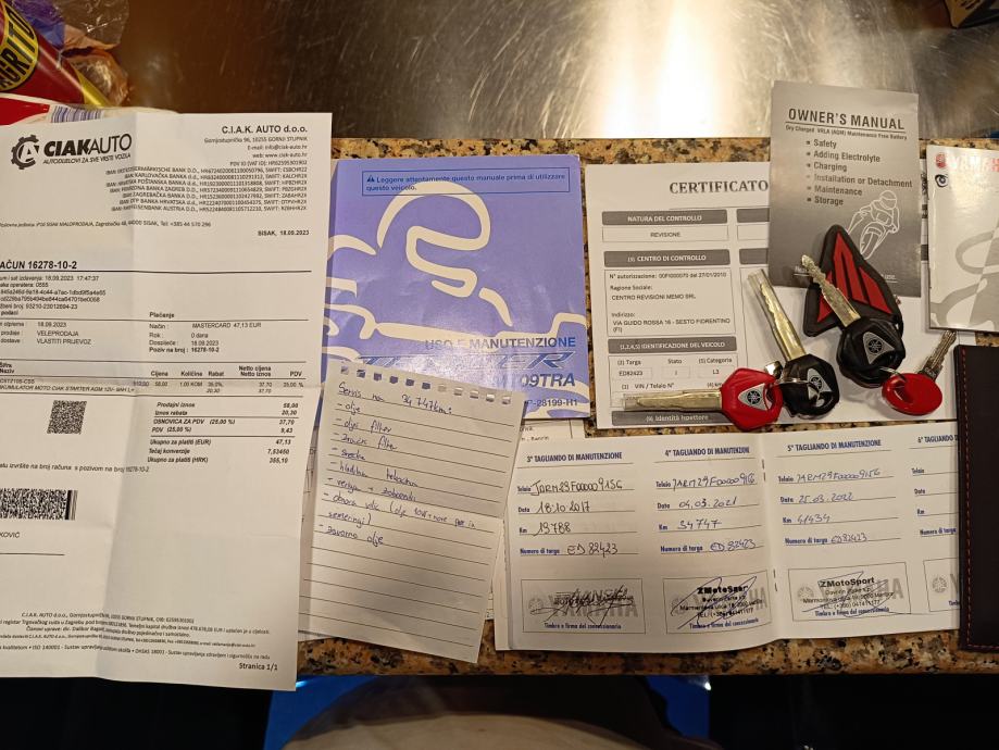 Sve što je rađeno na servisima upisano, akumulator nov prošle godine, prednja guma potpuno nova, stavljena prošli tjedan.