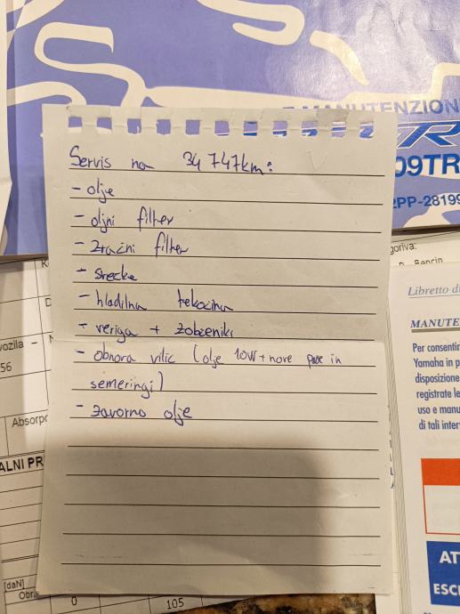 Napravljen komplet servis kod Grigić motori(Yamaha), svjećice, svi filteri, ulje, lanac i lančanici, novi senzor protoka zraka(za sve posjedujem račun)