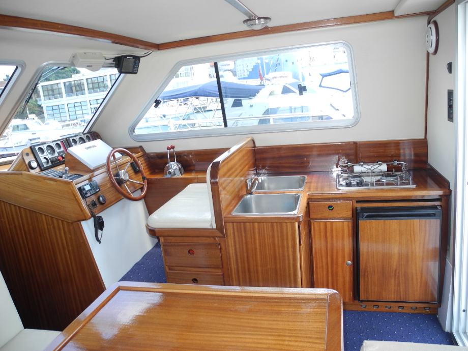 Safety equipment: life belt, life jackets, fog horn, radar reflector, auxiliary rudder, reflector with remote control, first aid, tow rope, rockets with parachute, flares, fire extinguisher (automatic).