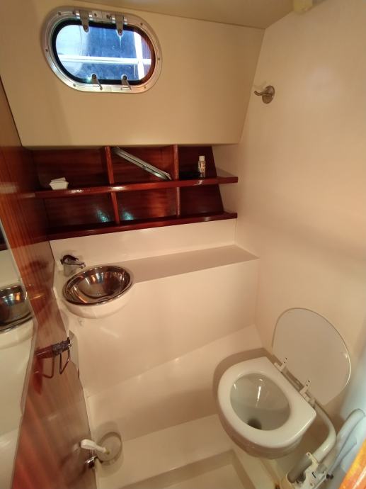 Tehnička oprema: Pramčani propeler, prikljucak 230 V na obalu, tlačni vodeni sustav, punjač baterije, solarni panel 350 W, električno sidro sa lancem 50 m, rezervno sidro.