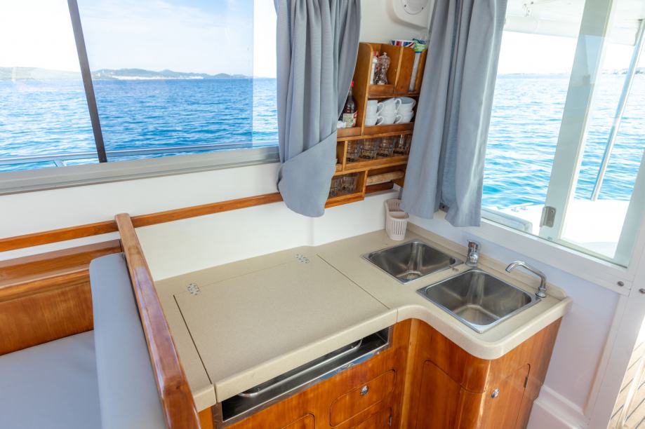 Tjedni najam broda sa tri kabine za 6 osoba, opremljen sa svom potrebnom opremom za sigurno uzivanje na moru.