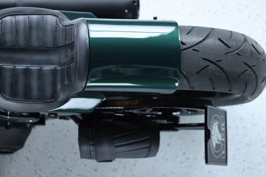 Motocikl je lakiran u British Racing Green – duboku, elegantnu nijansu koja u sjeni djeluje tamno i ozbiljno, a na svjetlu otkriva bogatu dubinu boje.