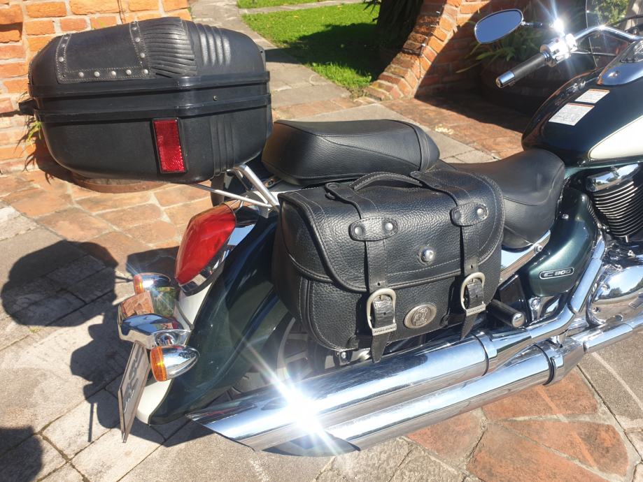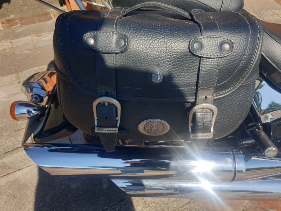 Dvoboja,tamnozelena i bež boja daju mu Military look u kombinaciji sa Hepco&Becker kožnim bisagama.One se skidaju klik-klak metodom i mogu se zakljucati.