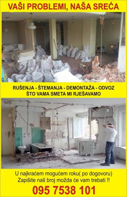 - usluge koje vršimo su; rušenje zidova, skidanje pločica, parketa , demontaza namjestaja ITD.
